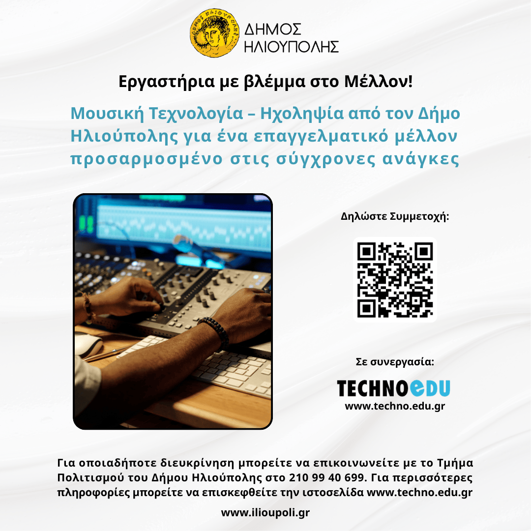 Ο Δήμος μας, σε συνεργασία με τον εκπαιδευτικό οργανισμό TechnoEDU, σας προσκαλούν σε ένα σύγχρονο Εργαστήριο 6 ατόμων, όπου οι συμμετέχοντες θα εξερευνήσουν όλο τον κύκλο της σύγχρονης ηχητικής παραγωγής – από τις βασικές αρχές αναλογικού και ψηφιακού ήχου έως τη μίξη, το mastering, το sound design και την τελική εξαγωγή ολοκληρωμένων ηχητικά έργων στο Cubase.